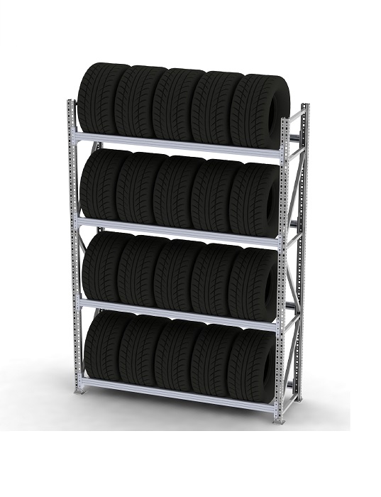 Стеллажи представляет собой легко собираемую и разбираемую конструкцию, которая состоит из вертикальных рам, закрепленных на них горизонтальных балок и накладок, стяжек. Используется для вертикального хранения автомобильных шин (дисков) на балках, расстояние между которыми меньше диаметра шин (дисков).