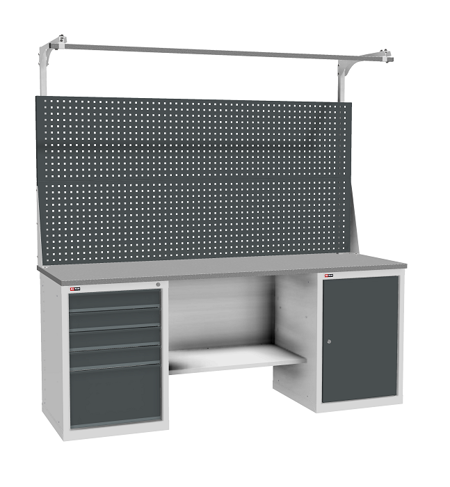 Цвет верстака: серый Ral 7038, лицевая панель ящиков/дверей антрацит Ral 7016. Тип покрытия: эпоксидная порошковая краска. Поставляется в разобранном виде