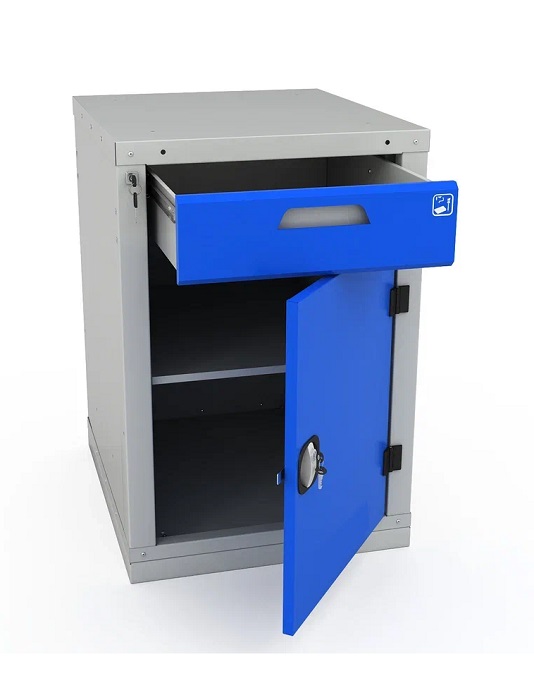 Цвет: корпус верстака - серый Ral 7035, лицевая панель тумбы Ral 5005. Поставляется в разобранном виде.