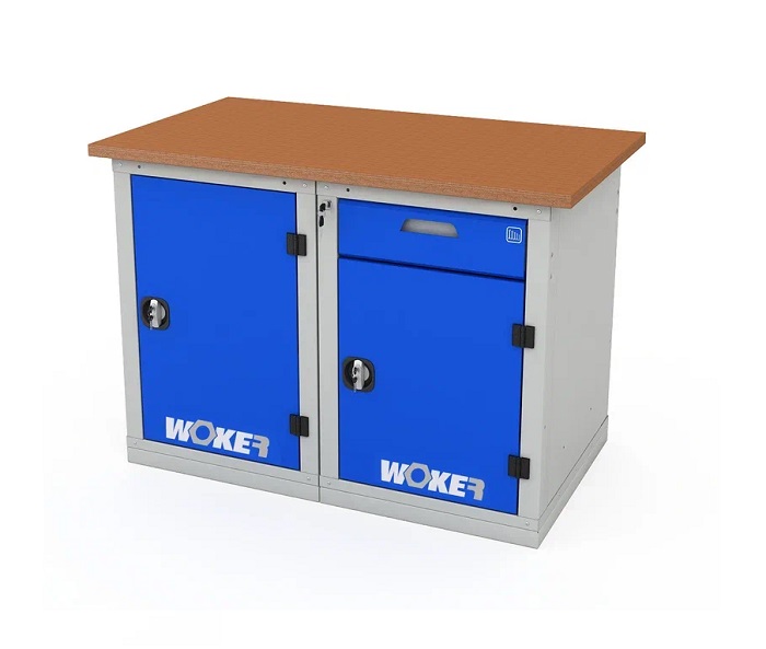 В комплектацию верстака входит: столешница Woker 1200, тумба Woker 01, тумба Woker 02. Столешница выполнена из шлифованной березовой многослойной фанеры толщиной 30 мм. Снаружи фанера обработана влагостойким антисептиком цвета "красное дерево", что придает фанере повышенную влагостойкость и более темный цвет. Тумба Woker 01 имеет две регулируемые по высоте полки (шаг 50 мм). Тумба Woker 02 комплектуется одной регулируемую по высоте полкой (шаг 50 мм) и одним выдвижным ящиком. В ящике есть противоскользящий коврик и набором наклеек с пиктограммами для маркировки содержимого. Полезный размер ящика: (ШхГ) 459х612 мм. Полки тумб установлены на стальные салазки, которые позволяют выдвигать полку на себя на 70% для облегчения разгрузки/погрузки. Двери тумб закрываются на цилиндрический замок со стальной поворотной ручкой, секретность замка 2000 комбинаций. Открывание двери на 180 градусов.